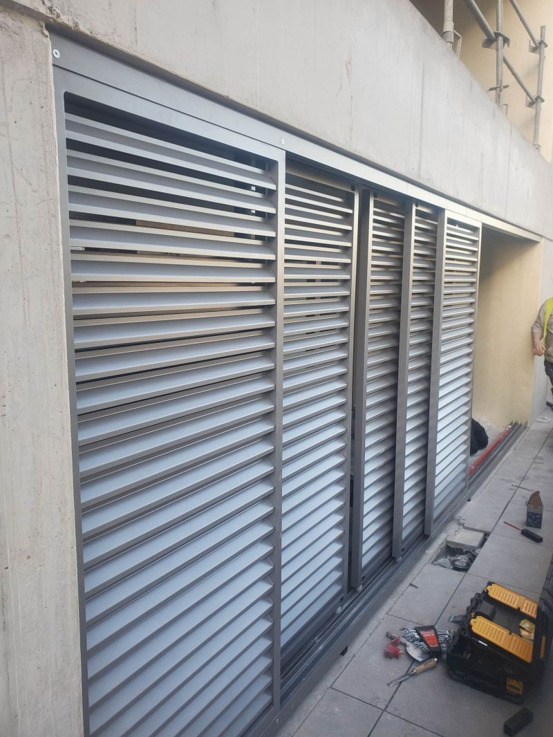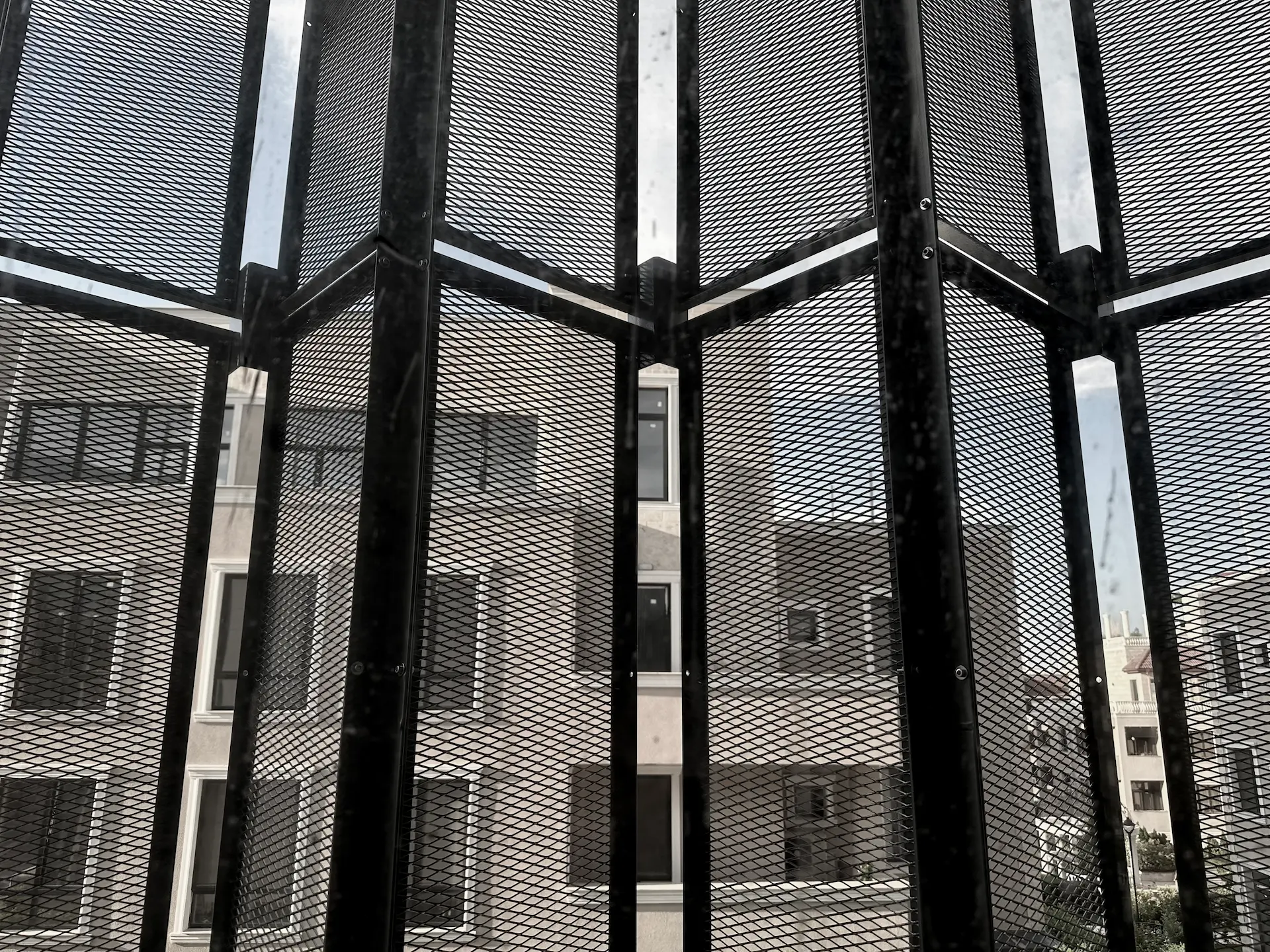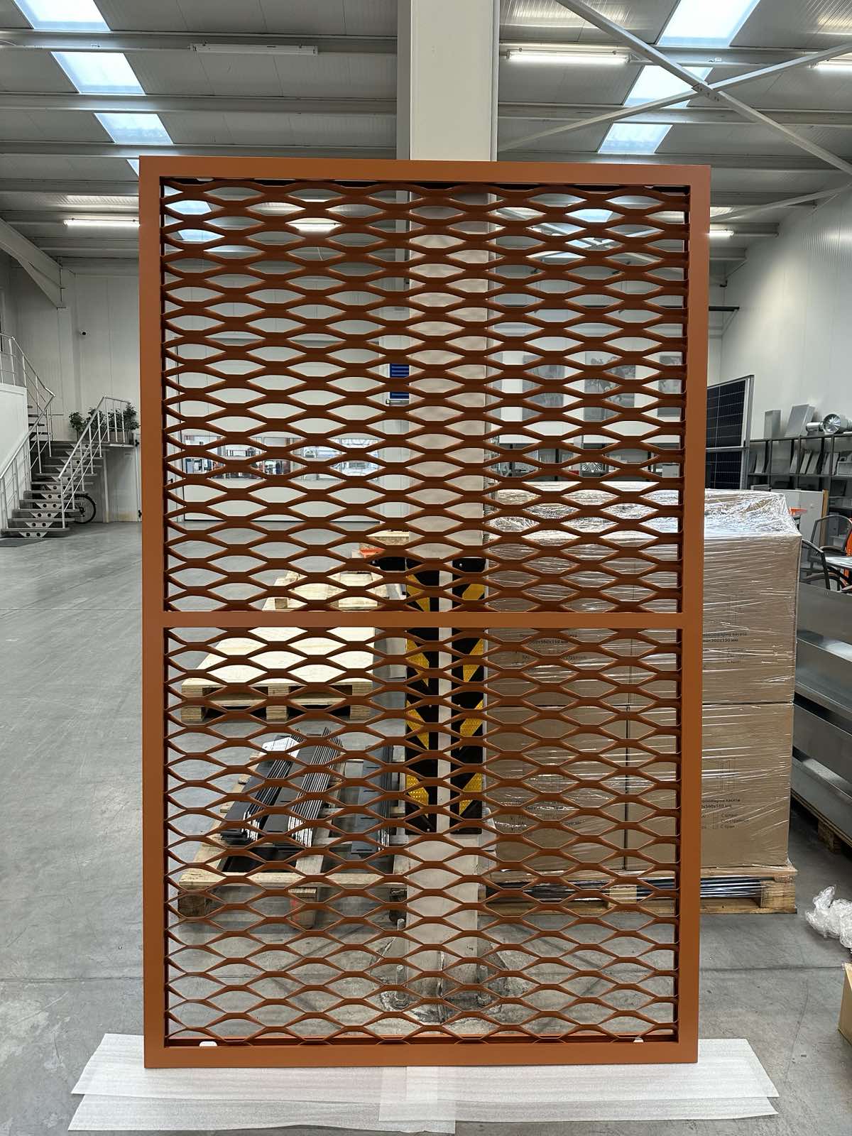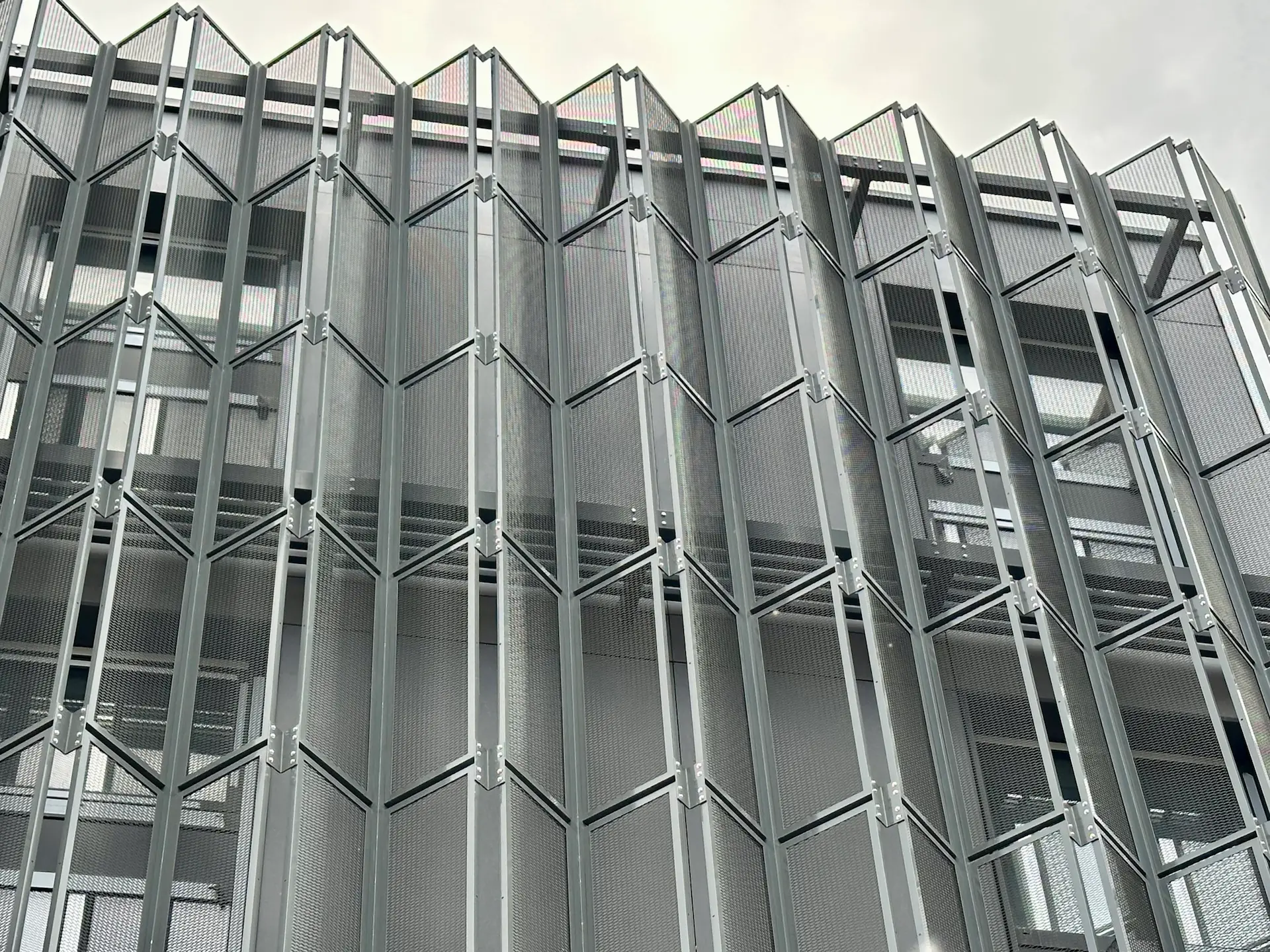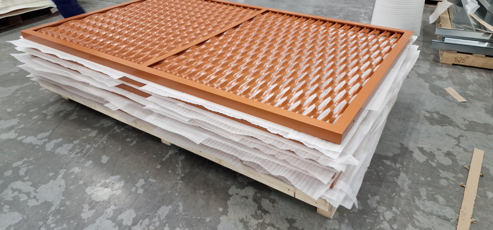 Дизайн, изработка и прахово боядисване на слънцезащитни фасадни пана от алуминиева мрежа и ламели.