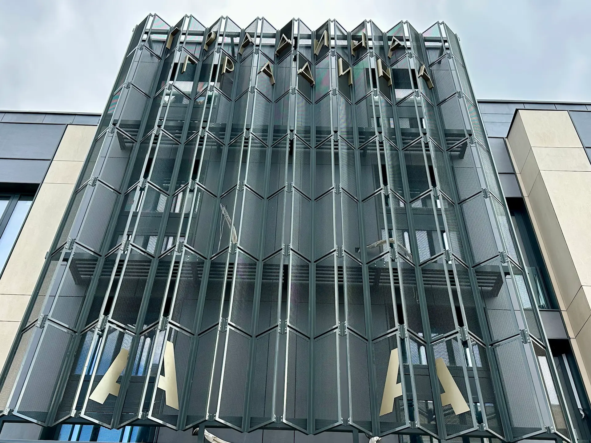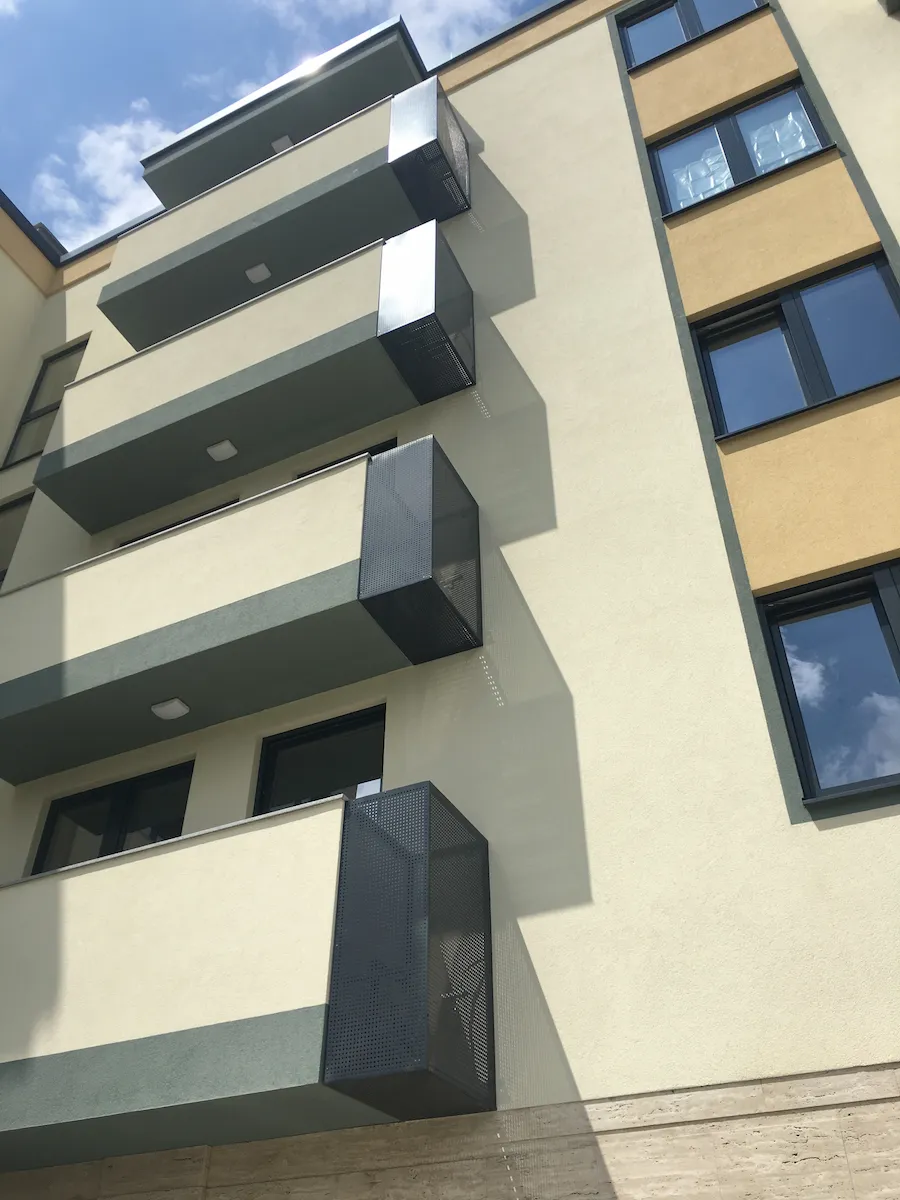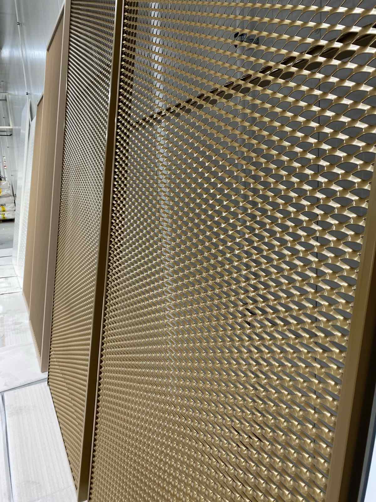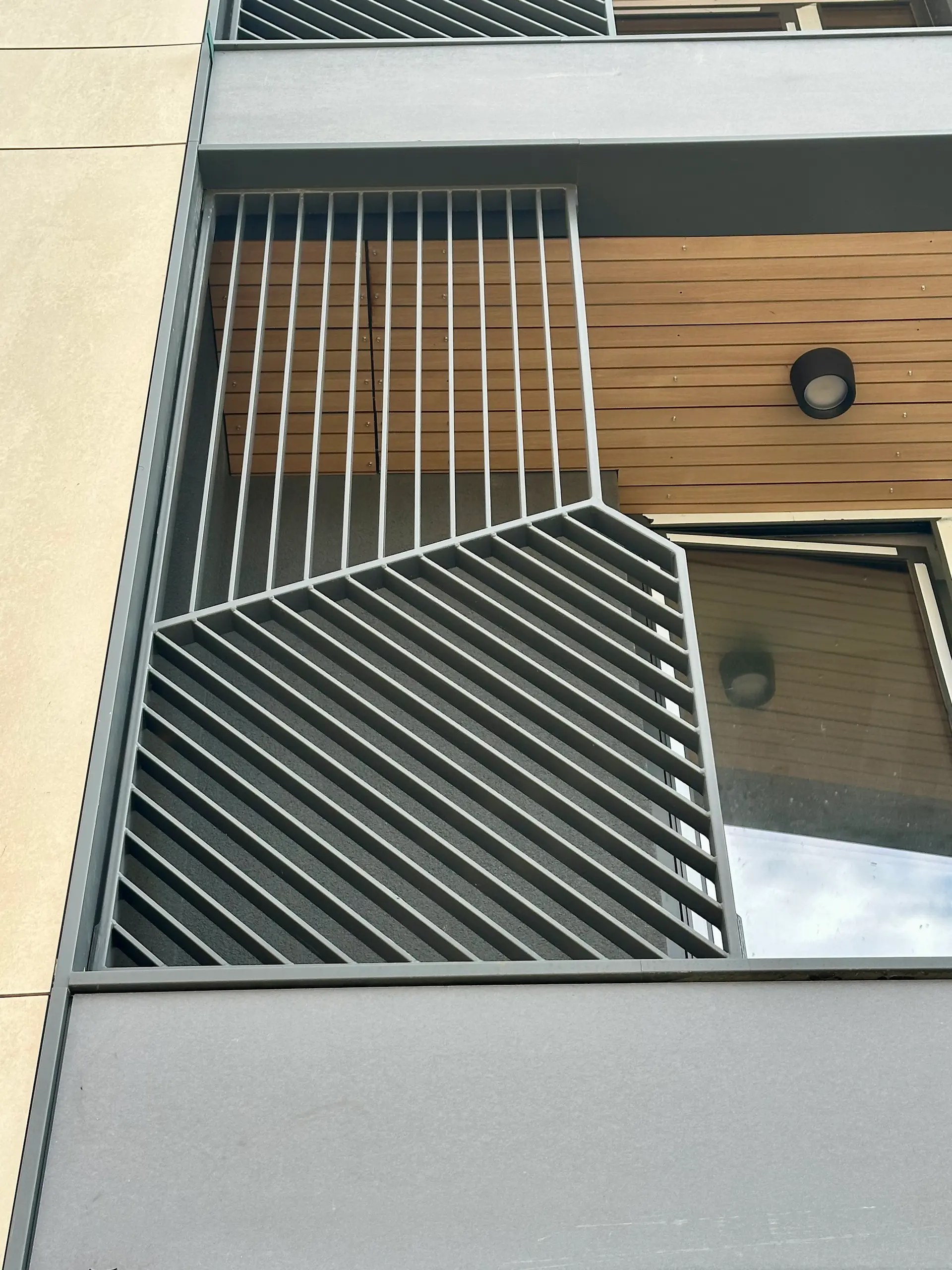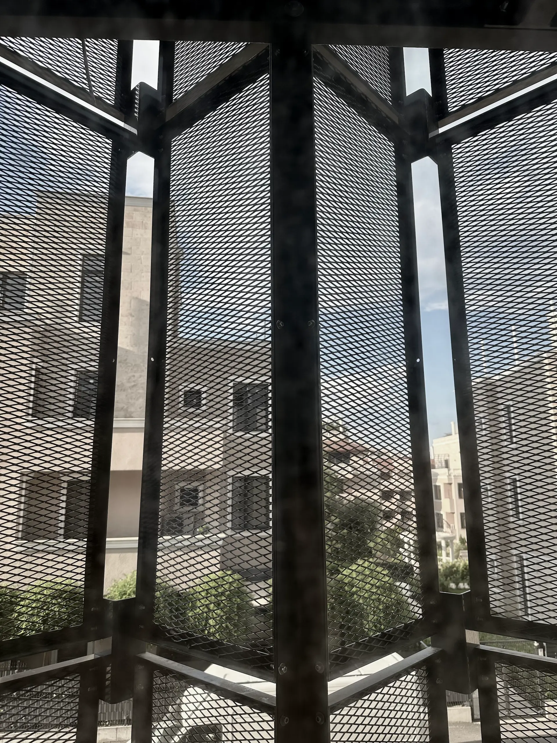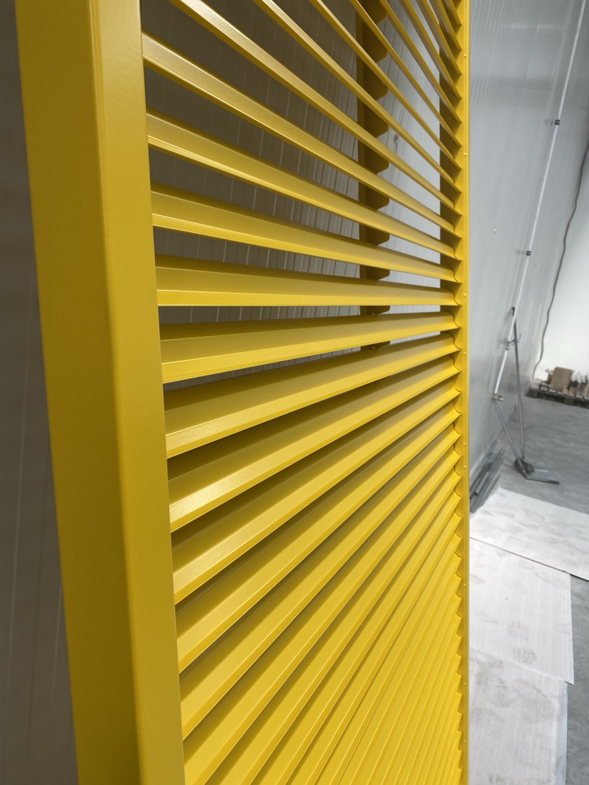Дизайн, изработка и прахово боядисване на слънцезащитни фасадни пана от алуминиева мрежа и ламели.