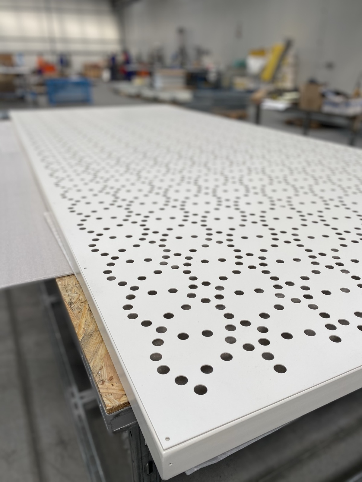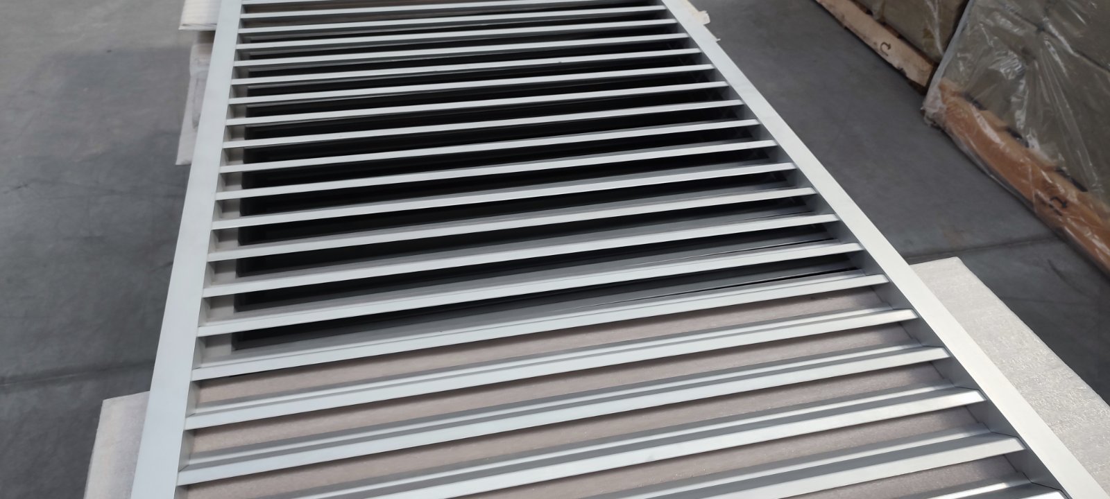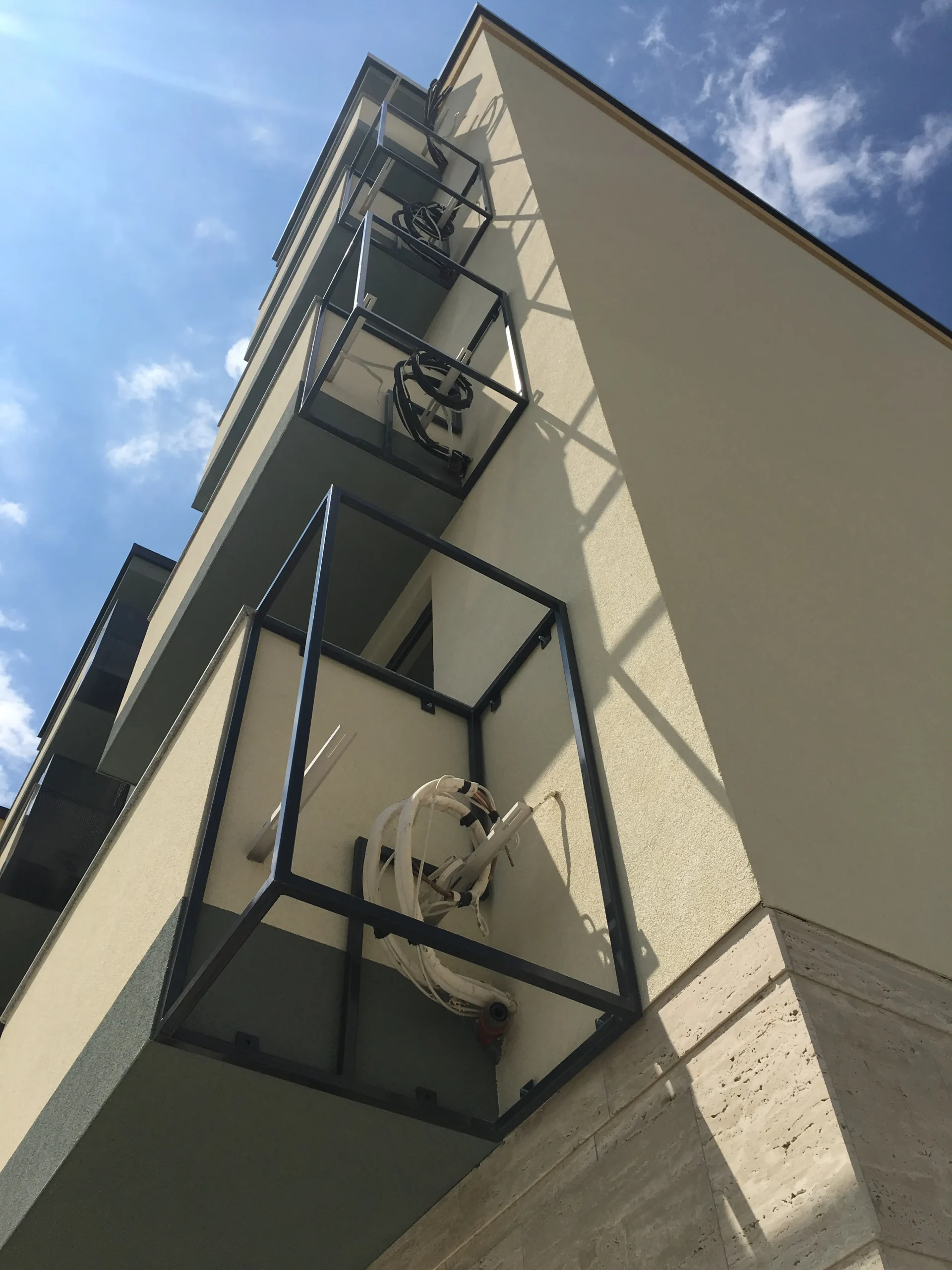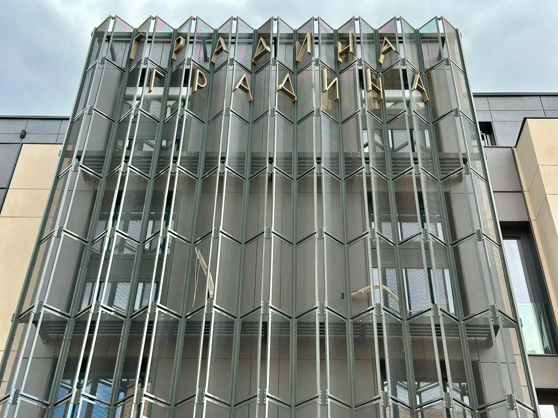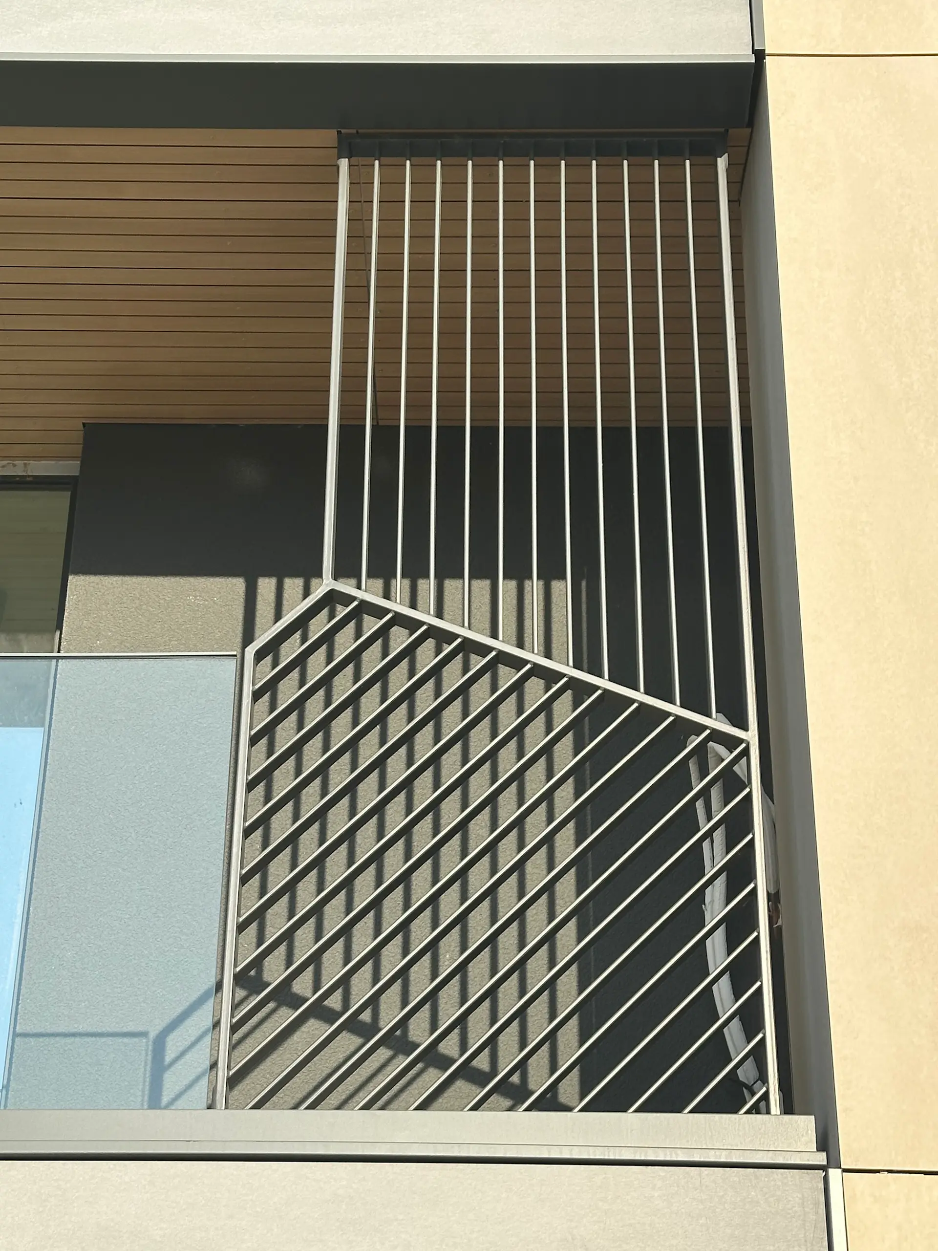 Дизайн, изработка и прахово боядисване на слънцезащитни фасадни пана от алуминиева мрежа и ламели.