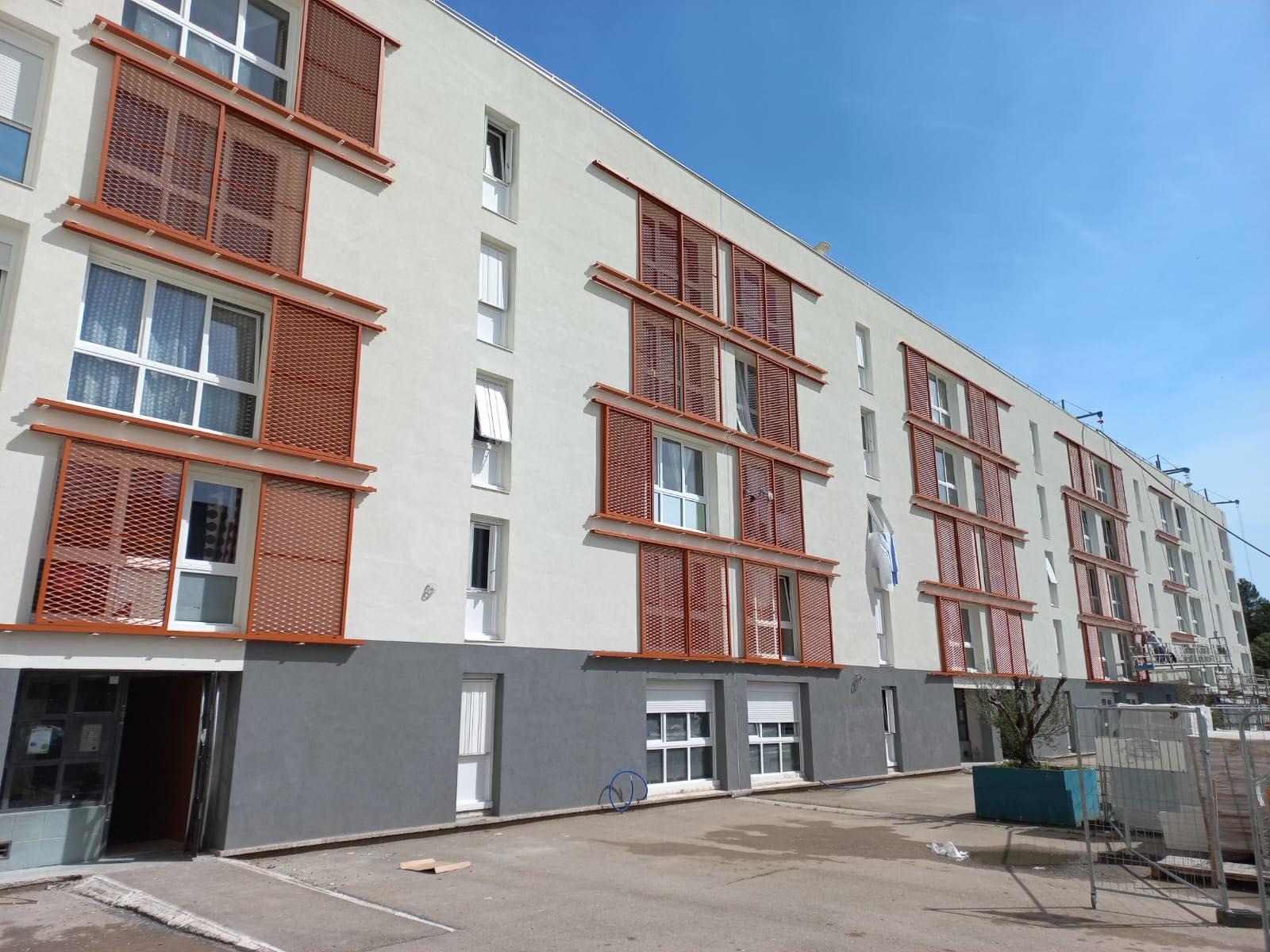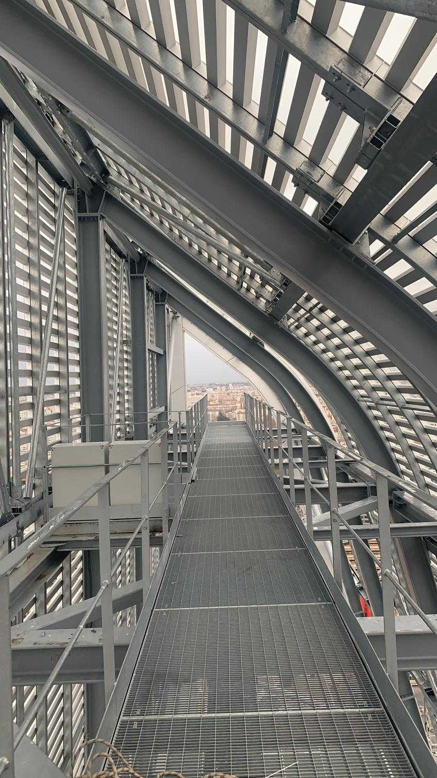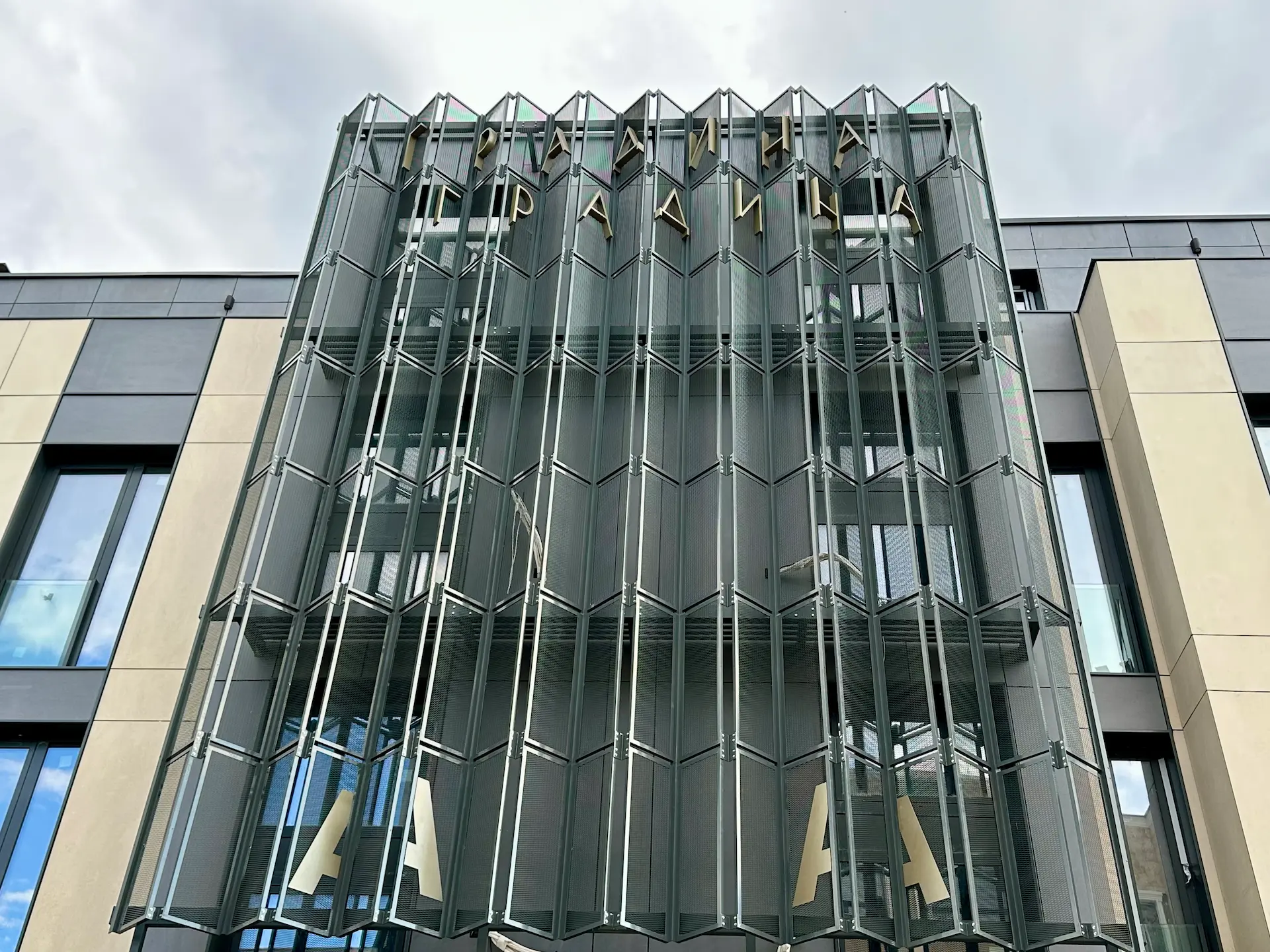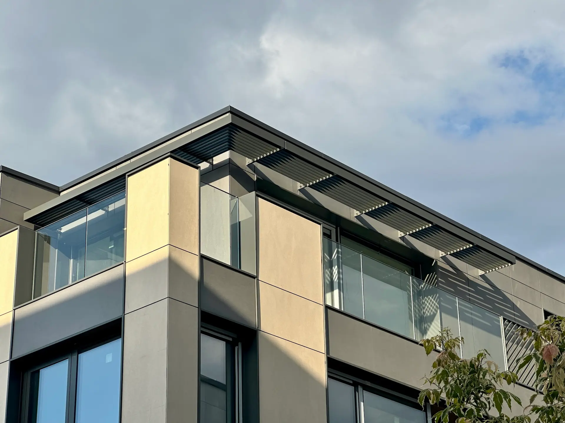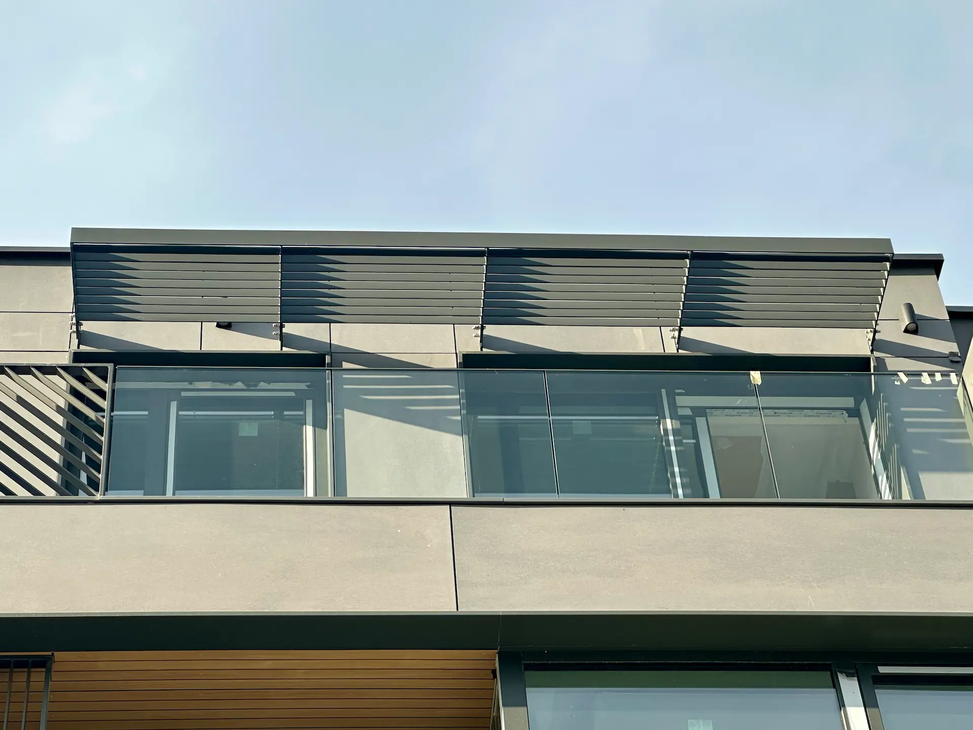 Дизайн, изработка и прахово боядисване на слънцезащитни фасадни пана от алуминиева мрежа и ламели.